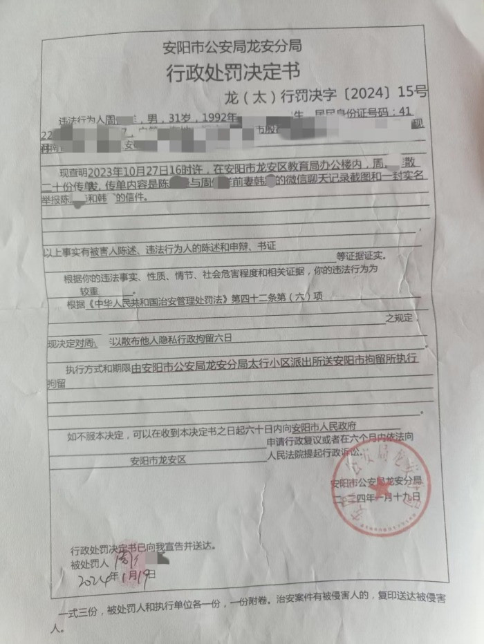 龙安区公安分局和该局彰武派出所出具的《受案回执》和《行政处罚决定书》显示,陈先生于2023年11月报警称被侮辱诽谤案,该所已经立案。周某因在龙安区教育局办公楼内散发20份传单,内有其前妻韩某与陈先生的聊天记录截图和一封实名举报信,被认定散布他人隐私被行政拘留6日。牵涉其中的贺某和李某也因公然侮辱他人分别被处行政拘留7日和罚款200元。