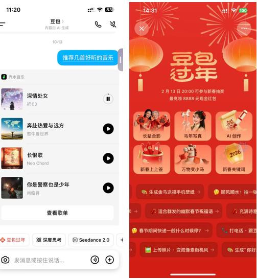 在家具端,用户通过“豆包过年”专区体验穿搭提醒、新春案牍生成、AI父老合影等功能,即可参与抽奖,最高可领取8888元现款红包。