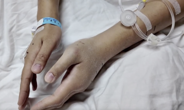陈先生就医后左手仍有显著肿胀,皮下似乎还有淤血,大拇指根部的两谈齿痕仍明晰可见。图源:广东播送电视台