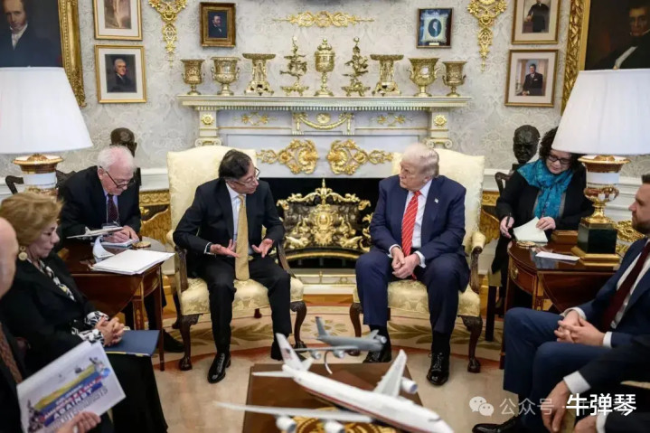 还有,在富丽堂皇的白宫椭圆形办公室,两位总统斜倚着交谈,旁边还有美国副总统万斯、国务卿鲁比奥,以及一众哥伦比亚高官。