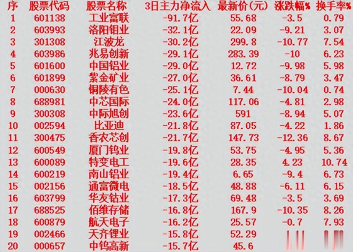 前3天主力净流出的名单汇总: