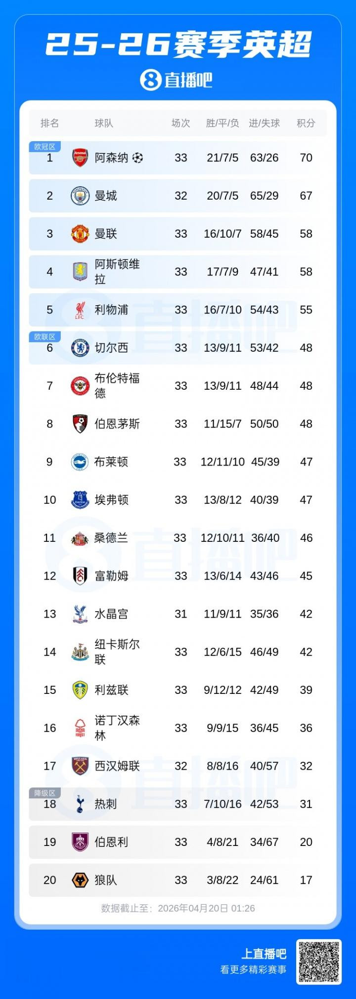直播吧04月20日讯曼城本轮2-1打败阿森纳,曼城少赛1场过时3分,阿森纳净胜球37,