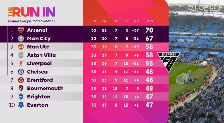 幸运5 临了会是抨击力之争吗? 枪手净胜球37曼城36, 曼城少赛1场过时3分
