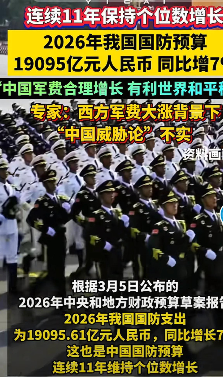 凭证3月5日提交世界东说念主大审议的2026年中央和场合财政预算草案,本年国防开销预算为19095.61亿元东说念主民币,同比增长7%。比拟2023年至2025年承接三年7.2%的增速,本年小幅下调了0.2个百分点。