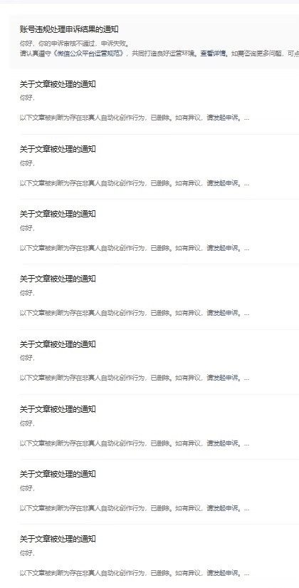 红星老本局4月9日音书,近日,有多位微信公众号运营者反馈,自后台著述被批量删除,领导是被平台判定为“存在非真东谈主自动化创作行径”。有运营者觉得,这与微信打击非真东谈主AI写稿、自动发布关联。