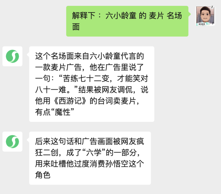 二方面是,元宝也并未准确识别到(基于落魄文)同音字(仅能按字面意思意思瓦解)。它无法推理得出当麦片与六小龄童同期出现的场景下,麦片就意同『卖片』啊。这算是AI中对于语义暧昧瓦解的缺失吗?