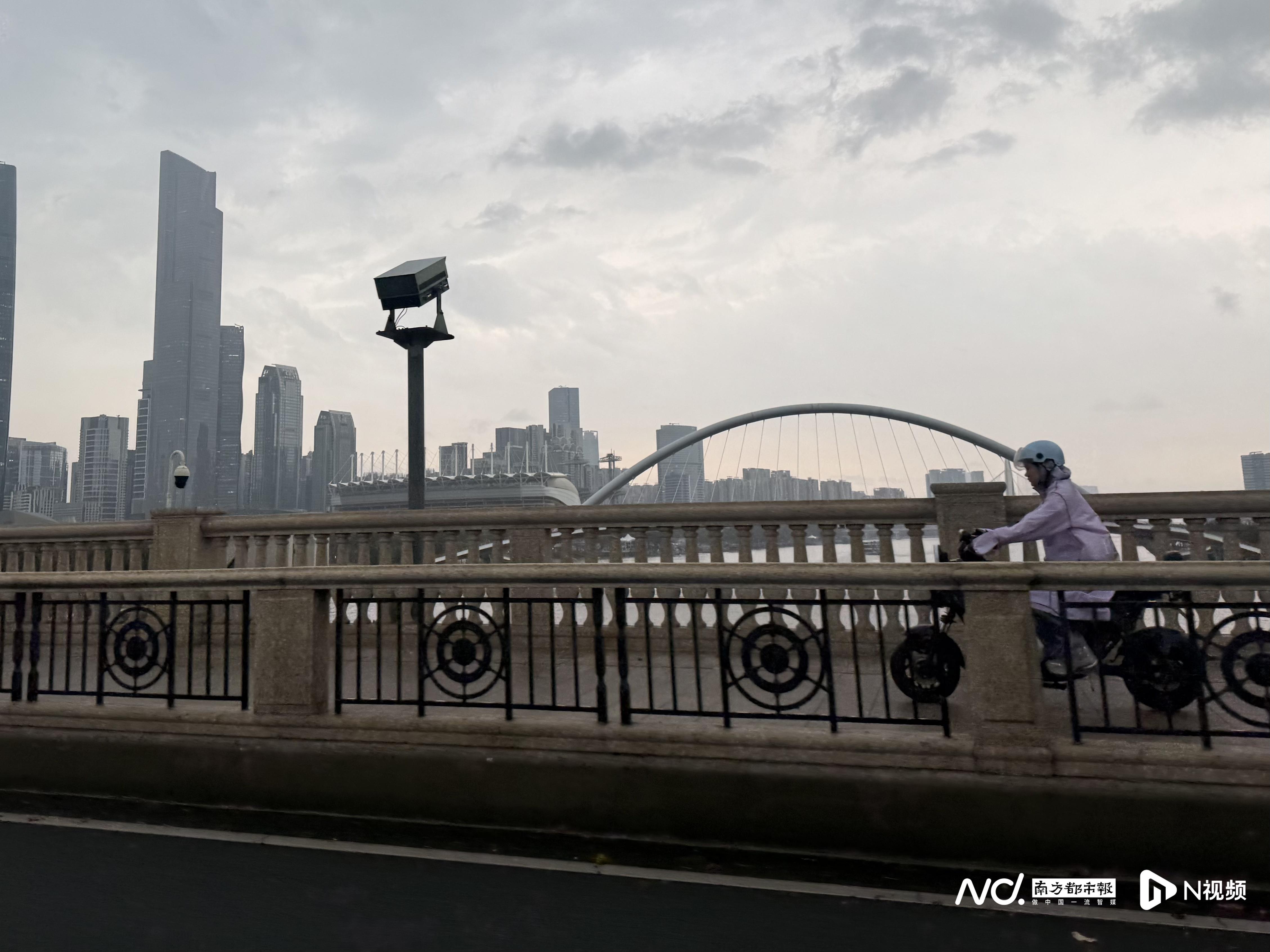3月30日,身着雨衣的广州市民在桥上骑行。南皆N视频记者韦娟明摄