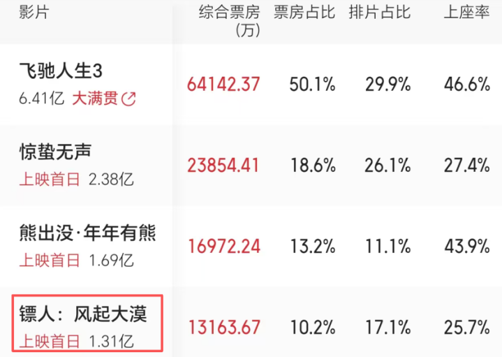 首映当日,影片的日票房仅有1.3亿,位列第四,连《熊出没·年年有熊》齐没“打”过。