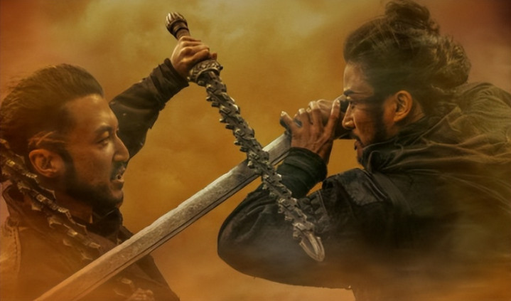 在沙暴中,吴京和谢霆锋双鞭与长刀顶风中借力发力,武器撞击声与风啸声交汇,这才是武侠片打戏的正确绽开表情。