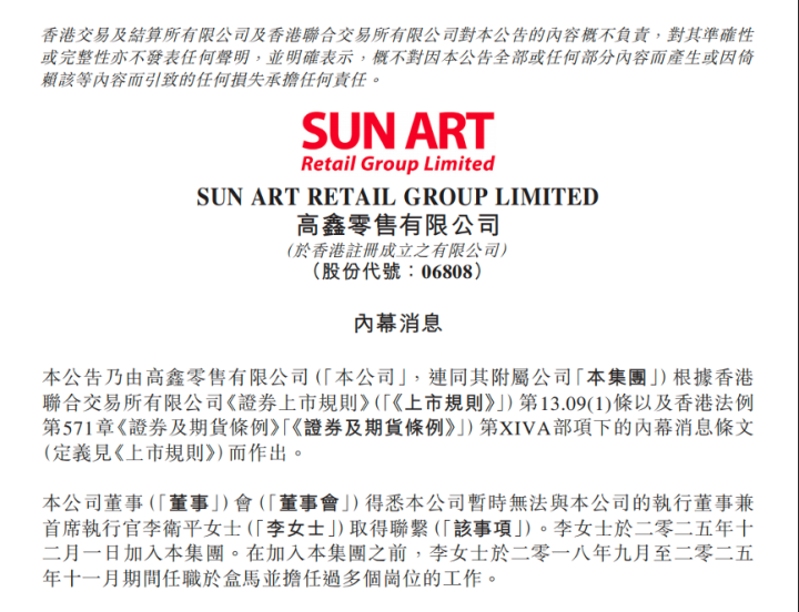 近期,有消息称大润发母公司高鑫零售CEO李卫平被警方带走协助调查。2月4日,大润发母公司高鑫零售在港交所发布公告回应称,该公司董事会得悉本公司暂时无法与本公司的执行董事兼首席执行官李卫平取得联系。董事会认为,该事项对本集团并无重大不利影响,且本集团之业务及营运维持正常。