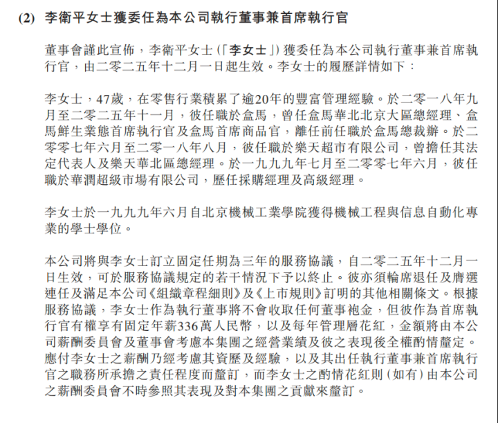 从过往经历来看,李卫平拥有26年零售行业经验,属于零售“老兵”。高鑫零售此前公告介绍,李卫平此前曾在华润超级市场有限公司担任过采购经理及高级经理,后任职于乐天超市有限公司,担任法定代表人和乐天华北区总经理。2018年9月,李卫平正式加入盒马,担任过盒马华北北京大区总经理、盒马鲜生业态首席执行官及盒马首席商品官,后在2025年11月离任,离任前任职于盒马总裁办。