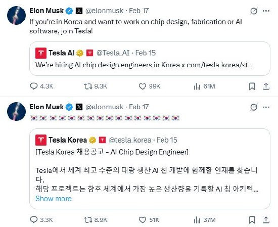 马斯克于当地时分17日在其应付平台X上转发了特斯拉韩国分部发布的东谈主工智能芯片设想工程师招聘信息。
