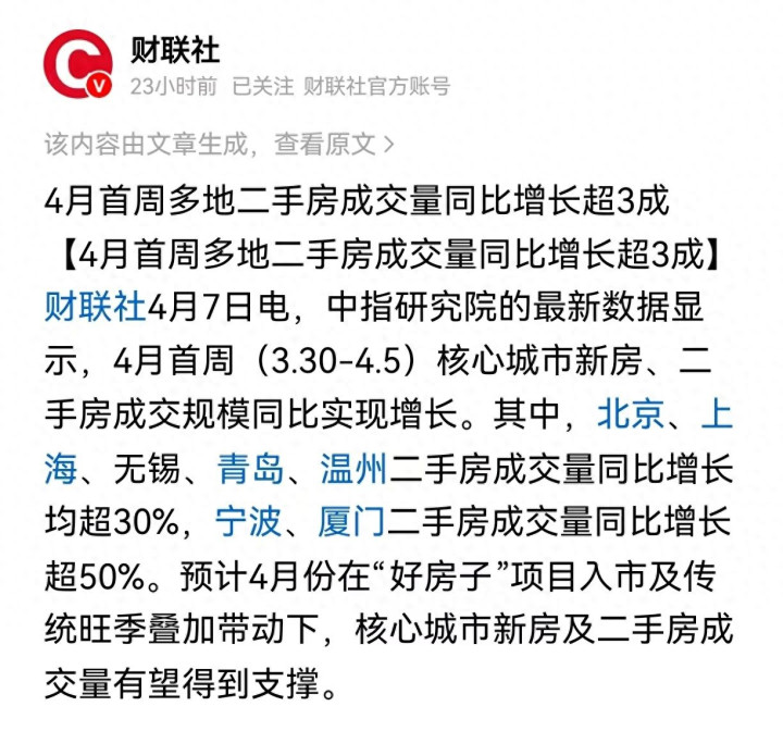 4月首周(3.30-4.5)国内一些中枢城市新址、二手房成交限制同比均兑现增长。
