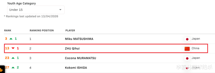 祝启慧当今在U15女单的世界排行径第2位,她的U19女单排行径第13位。昭着,祝启慧干预的WTT青少年比赛不够多。当今U15女单世界排行第一的是日乒选手松岛好意思空,而位居U19女单世界第一的是张本好意思和。