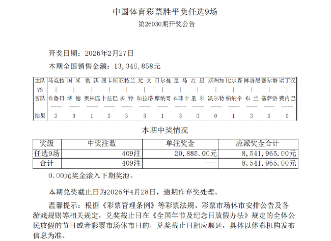 任九开奖北京技术2月27日,足彩任九第26030期开奖效果揭晓。本期任选九场开出409注,单注奖金20885元。本期任九投注总数为13,346,858元。