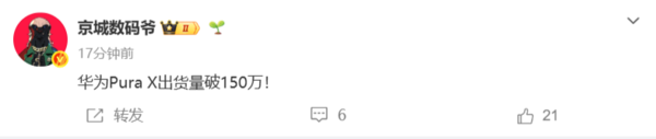【CNMO科技音问】4月13日,博主“京城数码爷”发文高慢华为Pura X出货量冲突150万台。