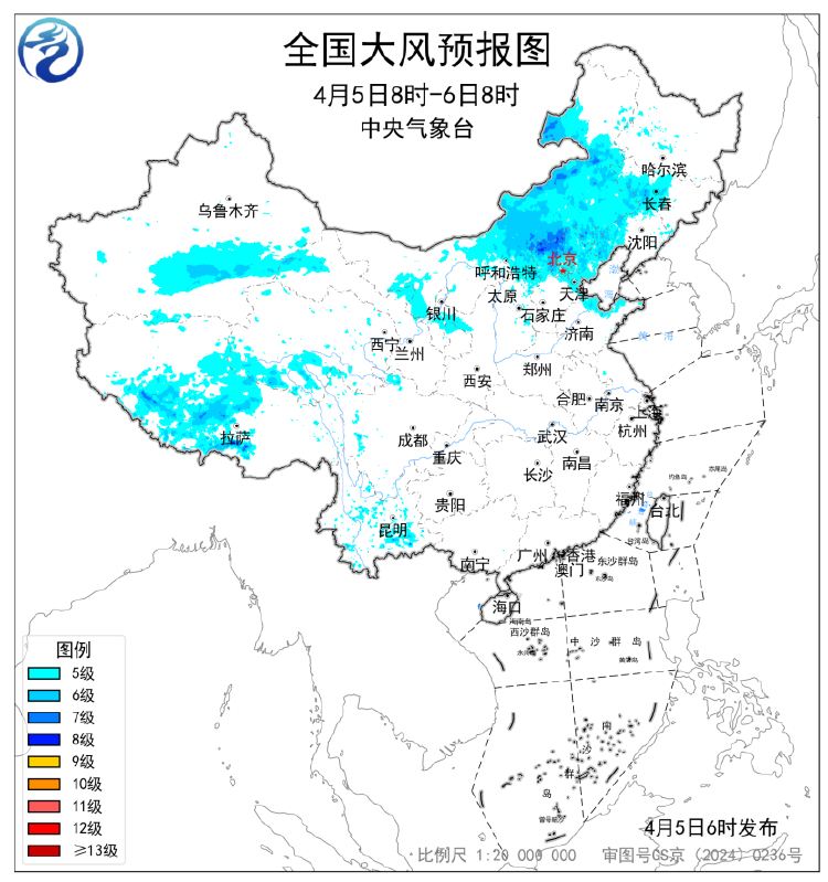展望,4月5日08时至6日08时,内蒙古中东部、山西北部、京津冀北部和东部、吉林西部、辽宁西部、山东北部、新疆南部、甘肃西部、青海南部、西藏中部、川西高原北部、云南南部等地部分地区有5~7级风,阵风7~9级;其中,内蒙古中部局地阵风10级以上。
