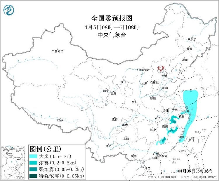 展望,4月5日08时至6日08时,黄海南部海域、东海西部海域、长江口隔邻海域、杭州湾、浙江沿海、福建沿海将有能见度不及1公里的大雾;此外,5日清晨至上昼,安徽东南部、江西的东部和南部、浙江北部、福建西北部等地有大雾天气,局地有能见度不及200米的强浓雾。