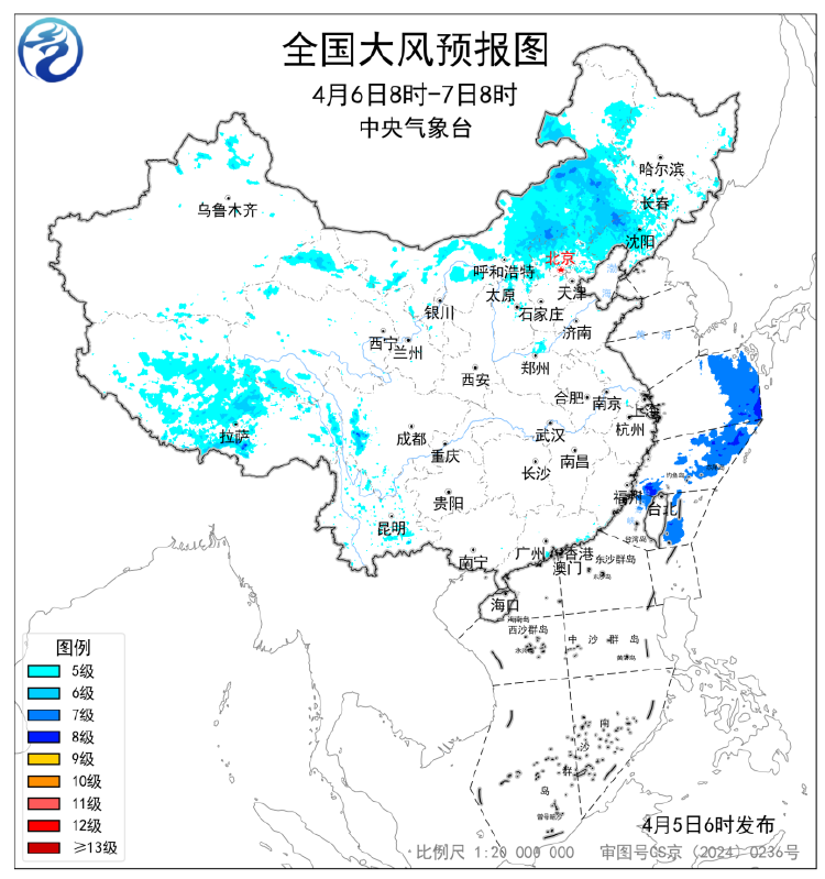 展望,4月6日08时至7日08时,内蒙古中东部、山西北部、河北北部、辽宁大部、吉林南部、新疆北部、甘肃西部、青海南部、西藏中部、川西高原、云南南部等地部分地区有5~7级风,阵风7~9级。台湾以东瀛面、东海东部海域将有7~8级、阵风9级的大风。