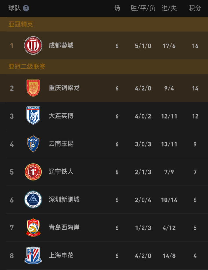 而升班马重庆铜梁龙发扬相通出彩,本轮2-0完胜深圳新鹏城,相通迎来3连胜而且开局6轮不败4胜2平,以2分之差接续稳居积分榜第2位。